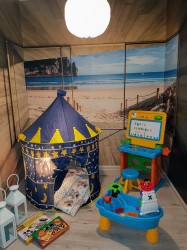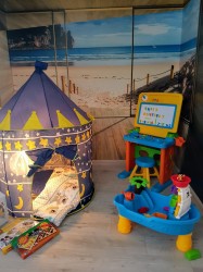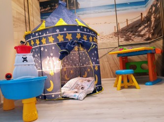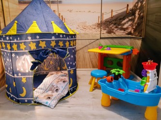 Kącikiem zabaw, gdzie dla najmłodszych dostępne są: gry planszowe, książeczki, malowanki, puzzle oraz piękny namiot (tipi), tablica edukacyjna, którą można zamienić w stolik, statek piracki do wszelakich zabaw.FF