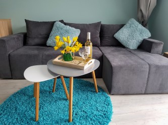 w salonie komfortowy narożnik z funkcją spania dla 2 osób, płaski telewizor z telewizją satelitarną łącznie ok. 1000 kanałów, stół z wygodnymi krzesłami,