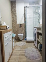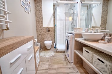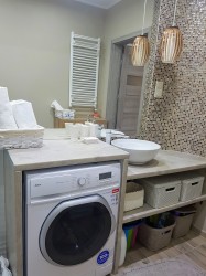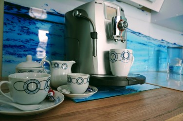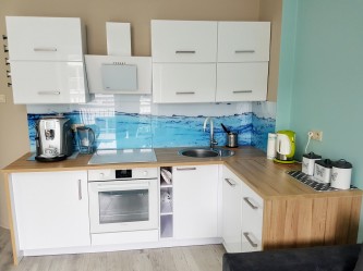 aneks kuchenny wyposażony w: lodówkę, zmywarkę do naczyń, płytę elektryczną, piekarnik, zastawę stołową, garnki, patelnie, robot kuchenny, czajnik, CIŚNIENIOWY EKSPRES DO KAWY SAECO (wraz z zapasem kawy dla Gości)